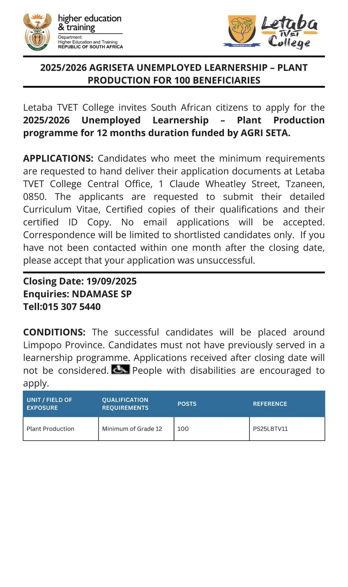 Letaba TVET College invites unemployed South African citizens to apply for the 2025/2026 Unemployed Learnership in Plant Production. This 12-month programme is fully funded by AGRI SETA and aims to provide skills development opportunities to 100 beneficiaries.